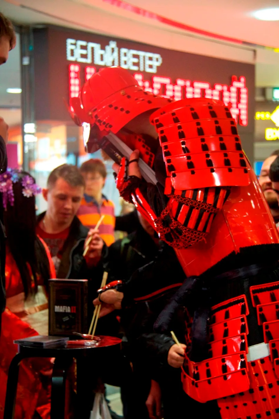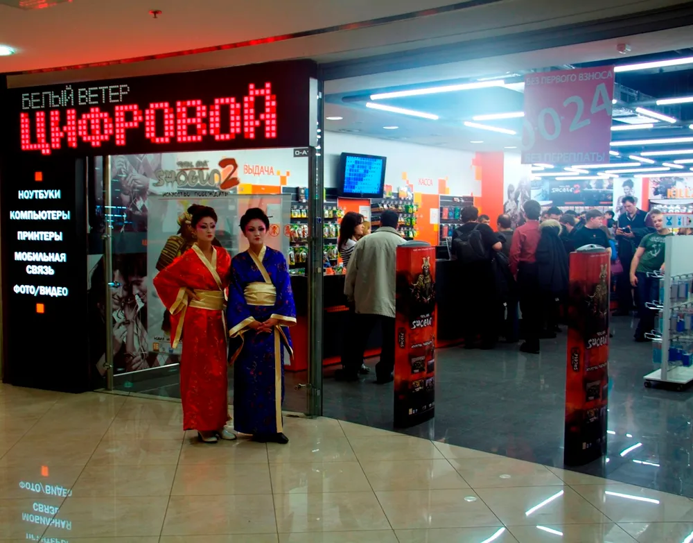 Белому Ветру в ТЦ "Европейский" не впервой проводить запуски продаж. Именно там была премьера Resident Evil 5 в сентябре 2009, там же запускали NFS Hot Pursuit четыре месяца назад, и вот теперь – Total War: Shogun 2. Премьера Сёгуна кардинально отличается от прошлых тем, что действо происходило не внутри душного магазина, а в просторном коридоре торгового центра, у входа в Белый Ветер. Отличия были в распорядке праздника: в18.00 началась развлекательная программа, затем в 19.00 продажи игры, и в теории через 10-20 минут после этого конкурсы продолжались уже для тех, кто игру приобрёл. Но реалии оказались таковы, что очередь за игрой начала собираться уже в 18.00, в итоге игрокам пришлось выбирать между участием в конкурсах и участием в этой самой очереди. Впрочем, даже те, кто стоял в очереди, могли насладиться обществом самураев и гейш, так что никто не возмущался.