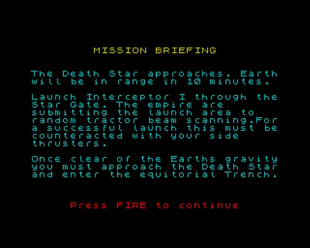 Поэтому пытаемся усерднее взлететь и игра вознаградит нас интересным аркадным геймплеем. Видеоигра вышла в1985 году для компьютера ZX Spectrum. Компьютер в те годы был очень популярен и основной метод управления – с клавиатуры. Но также вы можете использовать и экзотические джойстики того времени. На выбор их целых три:Kempston joystick, Sinclair joystick,cursor joystick. Все эти настройки можно увидеть в главном меню. Как только будете готовы – жмите клавишу L на клавиатуре. L означаетLauch Interceptor. Перед запуском можно выбрать и уровень сложности – нажимайте клавишу S (Skill).