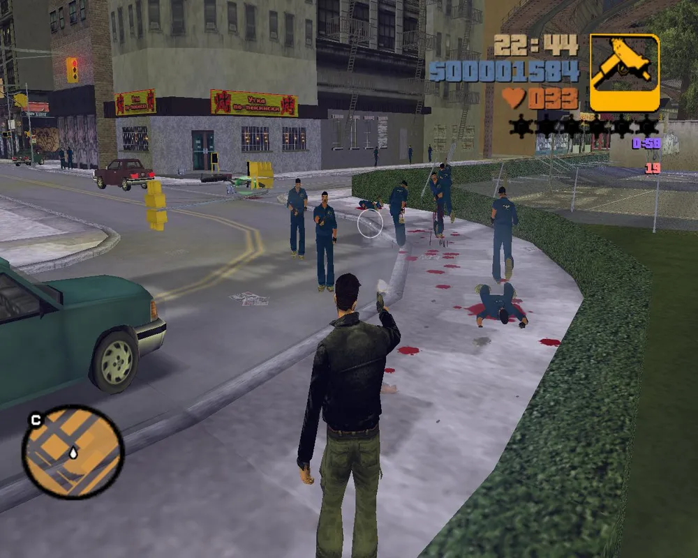 Вы спросите, чем же был недоволен мэр Нью-Йорка, как игра компрометирует вверенный ему город? У-у, это самое сладкое. Первое что бросается в глаза, это разгул бандитизма. Районы города оккупировали несколько преступных группировок, таких как итальянская мафия, китайская триада, колумбийский картель, японская якудза и несколько вымышленных размахом поменьше, вроде банды диабло, вооруженных лишь бейсбольными битами. Разумеется, все они так или иначе встречаются по ходу сюжета, но также представляют нескончаемую армию вооруженных отрядов, патрулирующих город пешком или на казенных автомобилях. То тут, то там постоянно возникают перестрелки с полицией, или стычки между враждующими бандами. Стоит напасть на одного, или просто нечаянно наехать, как все остальные его сообщники попытаются убить Клода. А уж когда по сюжету за его голову назначается награда, тогда Либерти Сити превращается в одно большое поле битвы. Налетая на кучку мафиози с дробовиками, впервые по-настоящему понимаешь, зачем Клода сделали не каким-нибудь рембо, а самым настоящим терминатором.