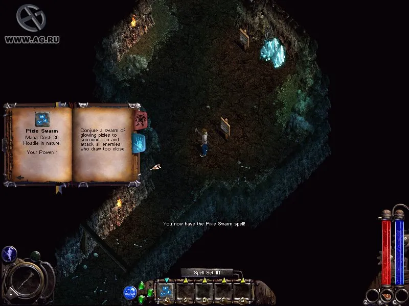 Маг – это маг. Ни добавить, ни убавить. На первых порах задохлик, превращающийся в машину смерти по мере своего обучения. Вам придётся много бегать по началу, да и потом. Но оно того стоит. Заклинания маг старательно записывает в свою персональную книгу заклинания. Чтобы кастануть как следует, он начинает бубнить под нос непонятные слова и показывать с огромной скоростью неприличные жесты во все стороны. В буквальном смысле! В момент прочтения заклинания рядом с игроком появляются быстро-быстро пиктограммы с пальцами, сложенными в причудливые комбинации. И только после этого происходит большой бадабум. Для чтения заклинаний маг использует ману, которую периодически приходится восполнять. Здесь Вествуды пошли на довольно оригинальный шаг. Конечно, можно глотать синенькое зелье из бутылок. Но кроме этого можно найти таинственные голубые светящиеся кристаллы и впитать эманации силы, исходящие от них. При этом кристалл помутнеет и потемнеет на некоторое время. Если восполнить запас не удалось, то придётся отойти и подождать или же поискать другой кристалл. что приятно, восполнение маны автоматически начинается при приближении к кристаллам. поэтому при битве с особо тяжёлым соперником иногда довольно забавно наблюдать за собственным персонажем нарезающим круги вокруг кристаллов, параллельно уворачивающегося от стрел, клыков и всего прочего, чем в него метят.