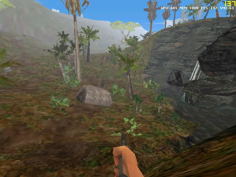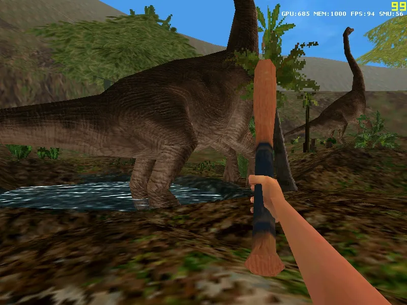 Первое что бросается в глаза, когда играешь в Trespasser – это пространства. Для 1998 года такие огромные пространства, да ещё и засаженные растительностью – это огромный шаг вперёд в развитии. Здесь применена технология неделимости игрового пространства и замещения 3D моделей двумерными спрайтами. Все объекты имеют двумерную и трёхмерную ипостась. Когда вы находитесь вдалеке от объекта – это низкодетализированный спрайт. Когда же вы подходите ближе, спрайт исчезает и на его месте подгружается трёхмерная модель. Такая технология была применена в CryEngine1 и игре FarCry.