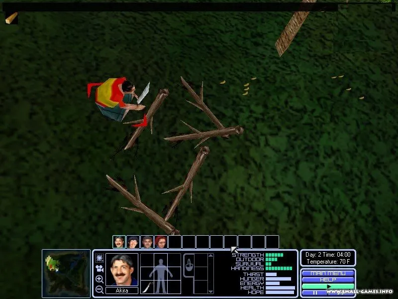 Но не будем уходить далеко от темы, ведь кроме перечисленных игр Мэтт Дики создал симулятор выживания на острове - «Wrecked!», который, благо, тоже может впечатлить. Игра с самого начала кидает вас в гущу событий. Помимо игрока, на острове куча животных и полуголых мужиков, при этом все норовят друг друга побить/загрызть. Я не утверждал, что впечатления будут положительными. Легкий шок вы можете себе обеспечить буквально на первых минутах. Если убить человека, то с него выпадут кусочки мяса, которые можно прямо на месте употребить в сыром виде. Может сложиться впечатление, что автор так и норовит обеспечить скандальность любому своему проекту, но на самом деле всё обстоит куда проще. Мэтт Дики очень необязательный разработчик. Wrecked появилась всего за три месяца, при этом, естественно, использовались наработки из прошлых проектов автора. Лень создателя даёт о себе знать регулярно, частые баги, непродуманность игрового процесса и ужасное управление - всё это непременные составляющие каждой игры Дики. Поэтому каннибализм в Wrecked - это ни сколько следствие авторской задумки, сколько банальная халатность во время разработки. Просто все живые существа при смерти теряют одни и те же ресурсы.