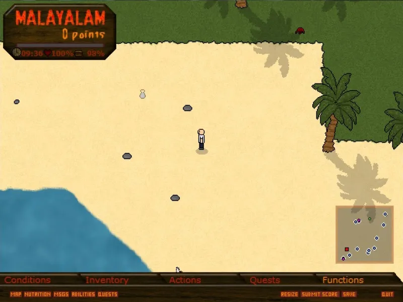 На самом деле остров просто огромен (около 120 регионов), на его исследование уйдут долгие часы, а если прибавить к этому времени выполнение всех квестов, общее число которых достигает двух сотен, то игра вполне сравнится по продолжительности прохождения со многими AAA-проектами. В отличие от многих предыдущих игр, Malayalam полностью оправдывает себя как симулятор выживания, ведь выжить тут - цель не для галочки. Персонаж должен не просто питаться, а питаться правильно, сохраняя пищевой баланс между мясом, фруктами, рыбой, протеином и железом. Помимо голода, основная опасность исходит от местной живности, среди которой есть реально существующие животные и мифические загадочные твари. Герой может совершать 12 разных действий, крафтить примитивные орудия труда, находить аптечки, специальные эликсиры и другие вещи, призванные облегчить существование на острове.