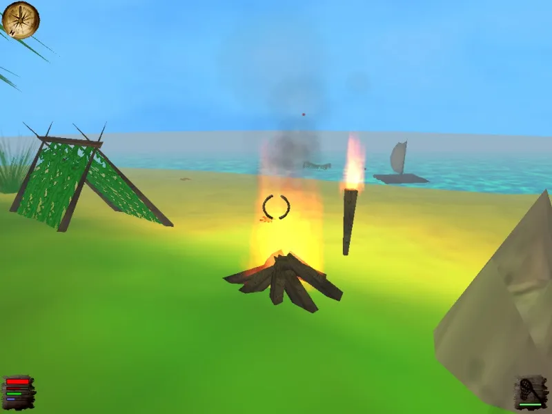Мы попали на остров. Зачем? Чтобы с него выбраться, конечно! Достичь этой цели позволит нечто, находящееся в храме в центре острова. По сути, необходимо пройти лабиринт с множеством троп, на вершине которого и находится вход в храм. Как же обойтись без препятствий: ловушки, ручейки из лавы и еще больше змей. Не забудем про потребности, шкала жизни всё еще уменьшается с каждой секундой, восполнить её помогут запасенные вами в море припасы или лужи с безвредной водой. Вся суть выживания, в принципе, сводится к поискам этих лужиц. Еще один фактор, не позволяющий пройти весь лабиринт с наскока, - блокируемые аборигенами пути (пропускают за монетки), а также сокрытый на острове ключ от дверей храма. Похождение внутри храма - третья часть игры. Опять лабиринт, но уже от первого лица. Никакого выживания, лишь поиск выхода. После всех приключений, герой, в конце концов, находит то, что поможет ему покинуть остров - древнюю ракету. Вот так поворот.