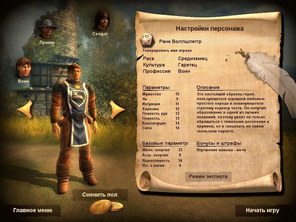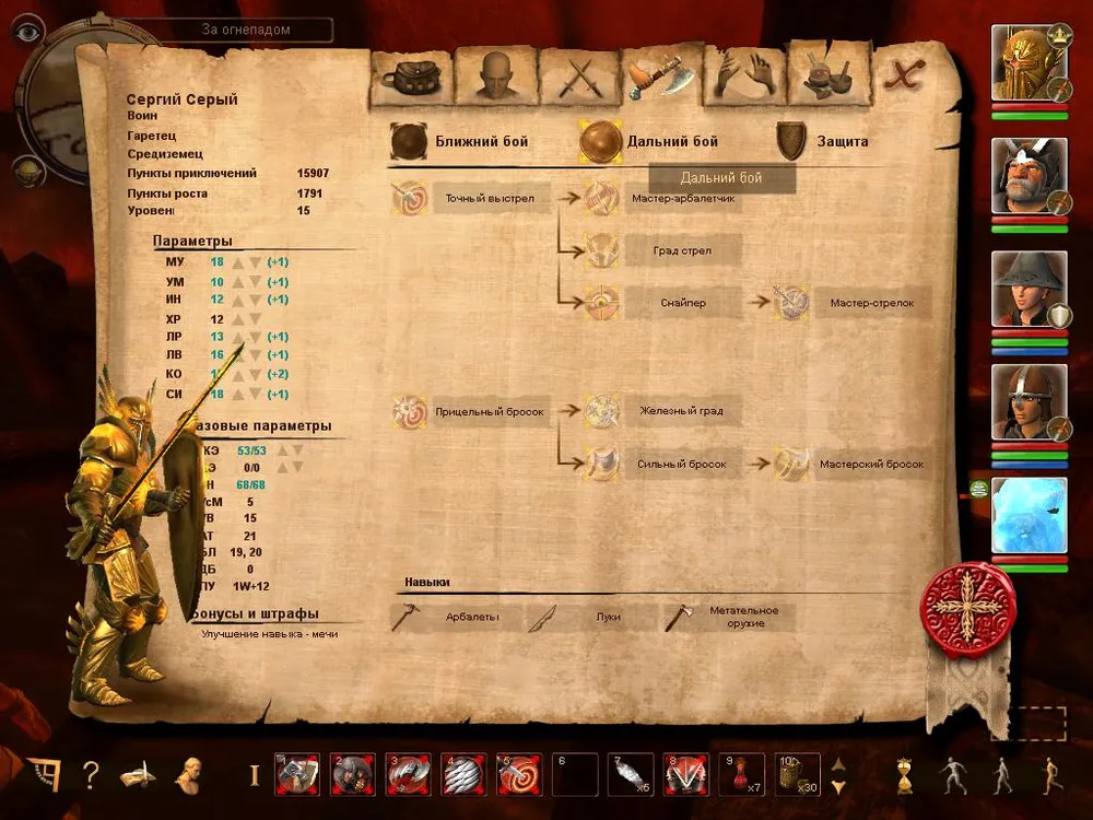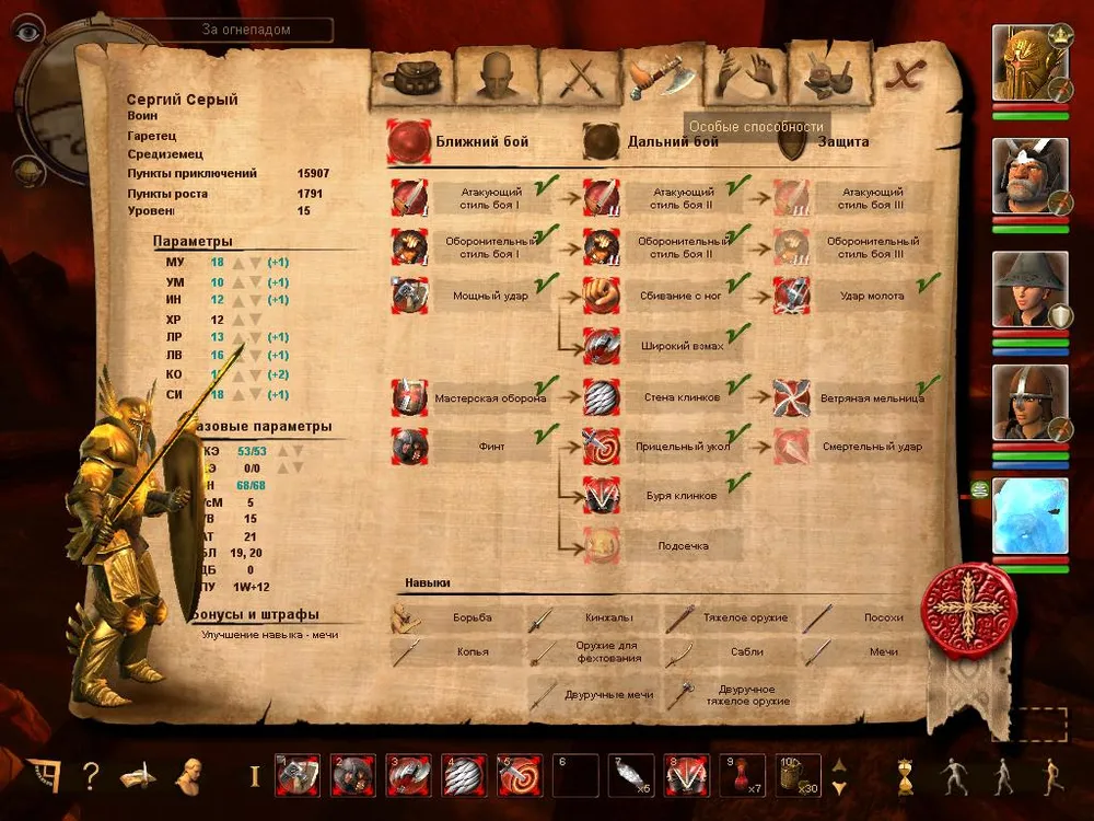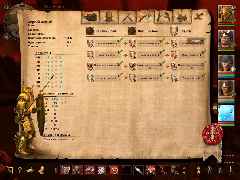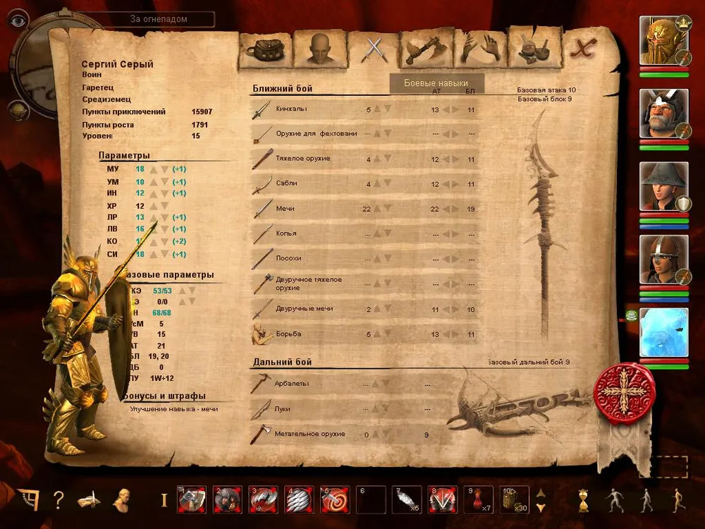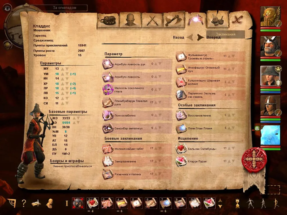 Левая часть экрана всегда одинакова, на ней отображается: класс персонажа, раса, уровень и количество очков опыта всего и доступных "к растрате"; далее идут классические параметры (стрелочками вверх/вниз обозначены те, которые можно улучшать). "Базовые параметры" - количество жизней, выносливость и мана (у персонажей обладающих магическими способностями) можно повышать с помощью опыта, либо улучшать "Параметры" (но стоят они дорого и в первой половине игры вряд ли хватит опыта для этого), либо ждать повышения уровня.