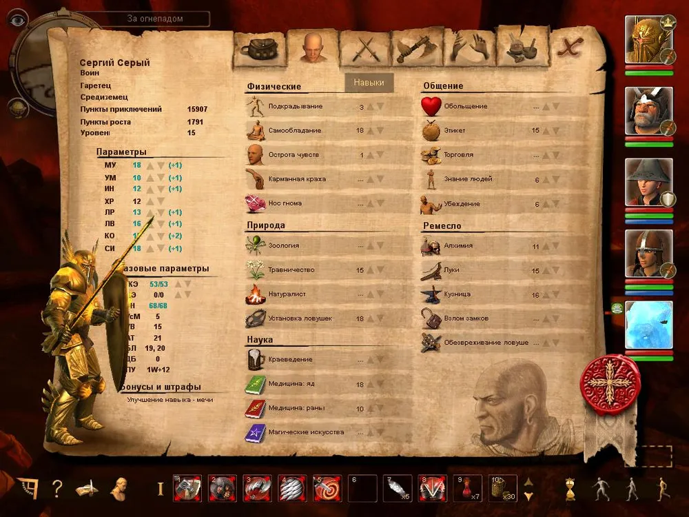 Тут думаю пояснять ничего не нужно, ролевая система во всей своей красе. Лишь дам совет - заранее решайте за что будет отвечать тот или иной персонаж, каждый может осваивать лишь пару профессий, иначе он либо будет неумехой, либо отстающим на поле боя. При этом в каждой из областей у вас должен быть специалист, иначе будет страдать вся партия (особенно это касается Природы, Науки и Общения)