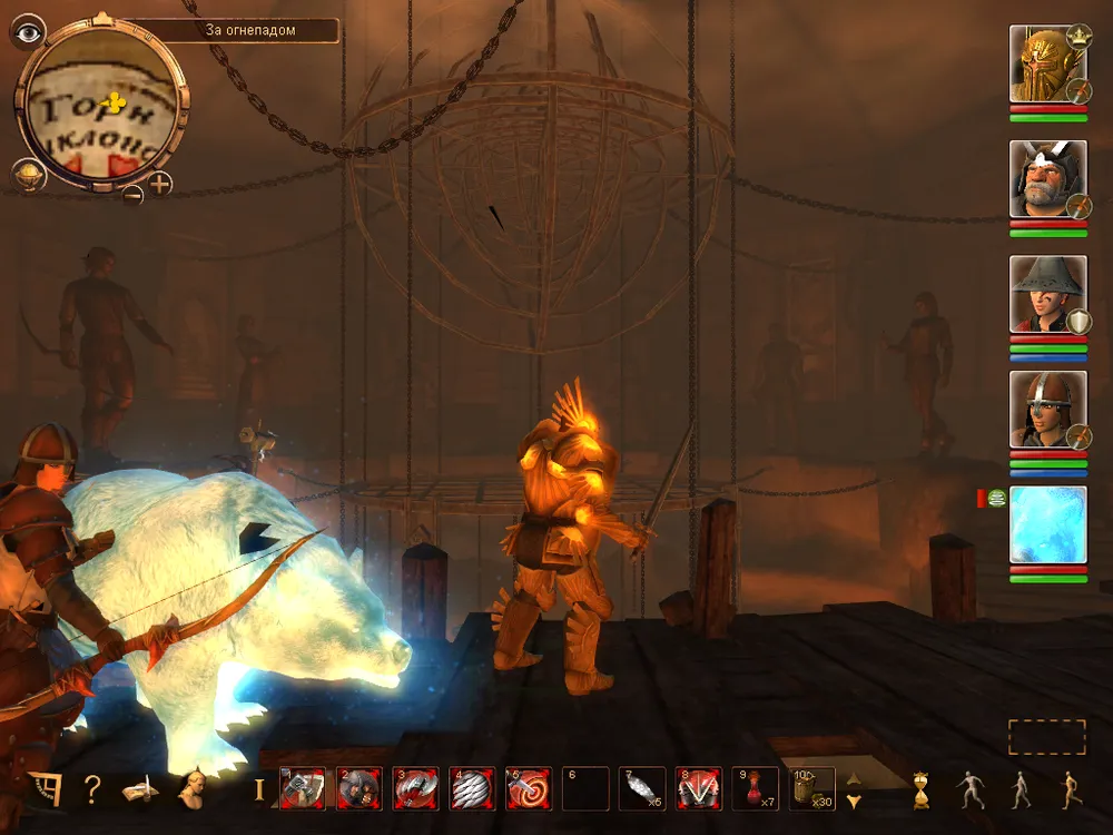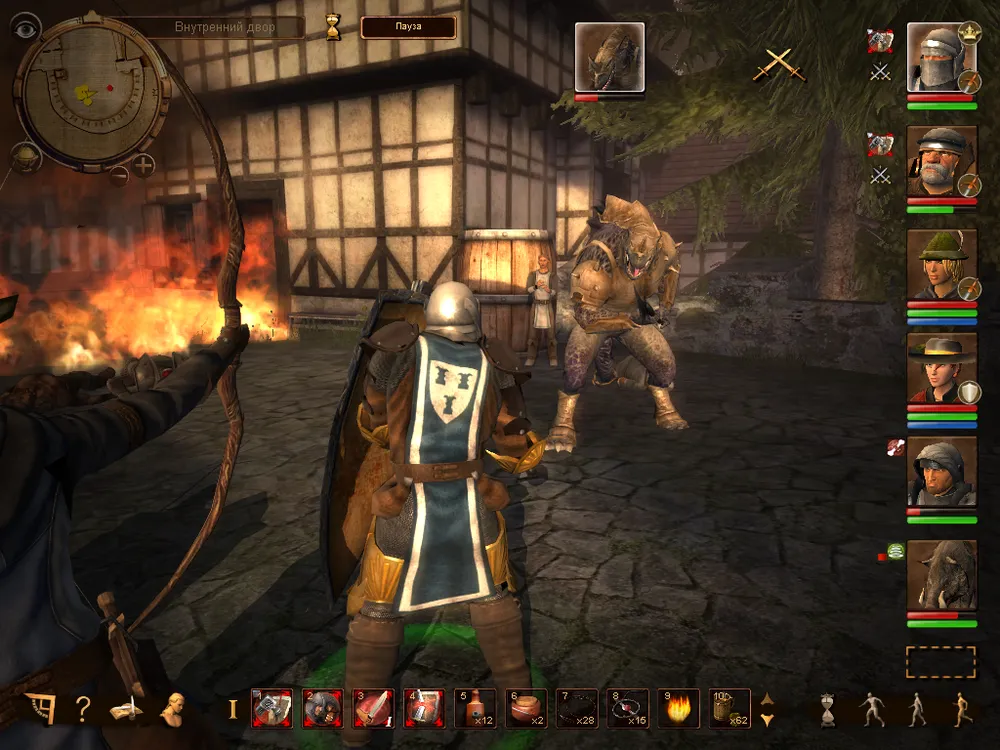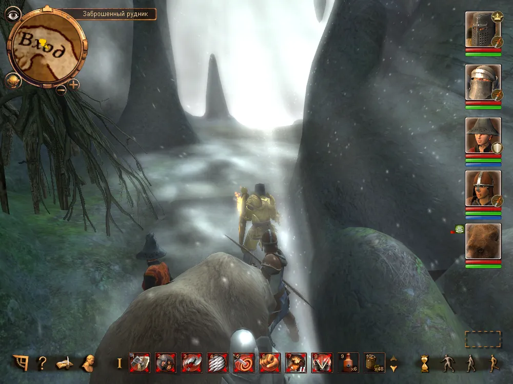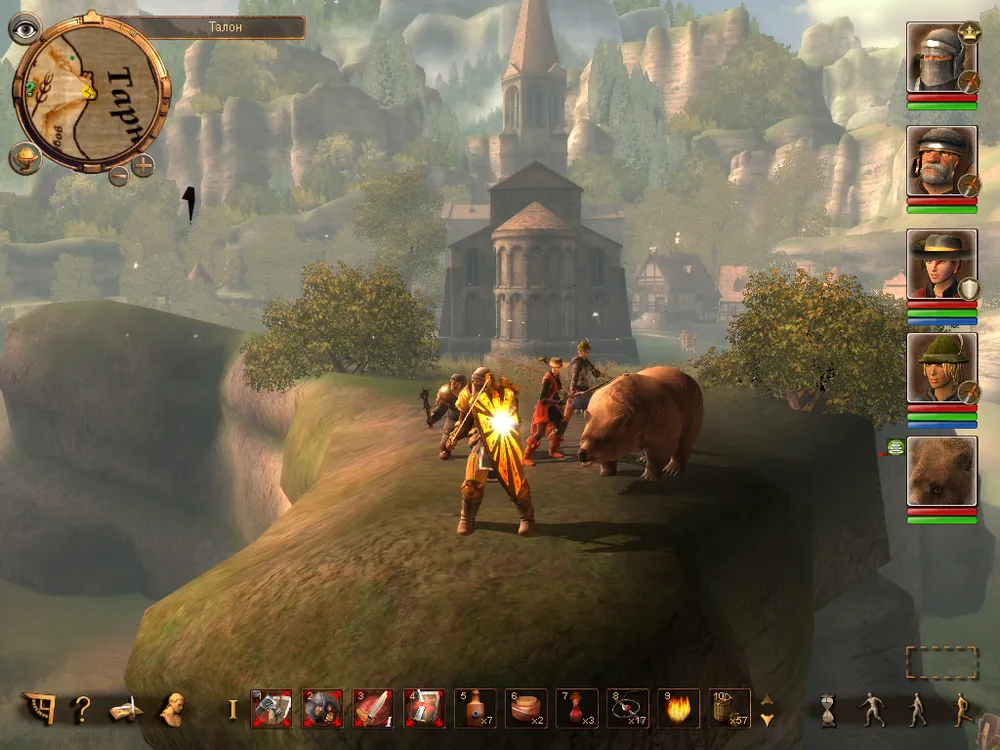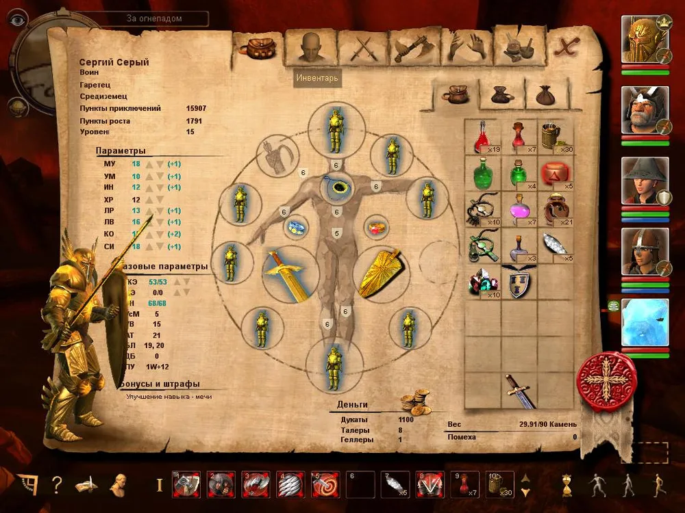 Итак перед нами RPG, в которой под нашим управлением находится до 4 персонажей (плюс вызываемые существа), а битвы проходят в реальном времени с возможностью использования активной паузы (нажимаем "Пробел", отдаём указания всем персонажам и повторное нажатием на клавишу возобновляем битву). Естественно в наличии панель быстрого доступа, куда следует переносить активные боевые умения/магические заклинания, а также зелья и т.д., можно использовать несколько панелей быстрого доступа (если всё не умещается в одну) для этого просто используем прокрутку вниз/вверх. Боевая система довольно запутана и для того, чтобы разобраться в ней придёться потратить некоторое время (игра делалась по одноимённой настольной немецкой РПГ и данный элемент разработчики не смогли доходчиво объяснить игроку), так что вместо урона от оружия нам показывают 1W+2, 1K+4 и т.д.