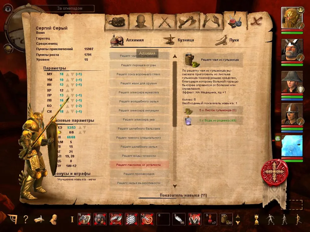 Последняя закладка показывает все имеющиеся у нас рецепты для крафта по всем профессиям (Алхимия, Кузница и Луки):