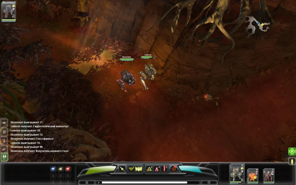 Игровой процесс больше всего напоминает старушку Diablo – камера парит над полем боя и мы, любуясь на макушку нашего генетического героя, вырезаем сотни чудовищ в лабиринтах чуждых планет и собираем иногда выпадающие деньги (выглядящие как спирали ДНК) и предметы экипировки. За уничтожение монстров крогенит получает опыт и растёт в уровнях, что позволяет ему открывать новых героев и расширяет ассортимент встроенного в корабль магазина. Всего перед миссией нужно выбрать трёх героев. Активен может быть только один, но в любой момент его можно заменить на любого из оставшихся. Каждый из героев обладает пятью уникальными навыками – один из них работает пассивно, второй применяется при нажатии на левую и правую кнопку мыши, а остальные с помощью цифр от 1 до 5. Да-да, я не ошибся – от 1 до 5, ведь третий навык героя становится доступен и двум другим. В результате у каждого из них получается по семь навыков – пять уникальных и два унаследованных от соратников. Не так уж много, но при грамотном выборе персонажей вполне хватает, ведь герои здесь различаются кардинально – древочеловек лечит и призывает чудовищ, полупрозрачный гуманоид с алебардой высасывает жизнь и очень больно бьёт, когтистая красная макака телепортируется и стреляет молниями, а боевой робот вообще устраивает артиллерийские обстрелы и выпускает самонаводящиеся ракеты. Всего героев в игре несколько десятков, у каждого своя история и роль в команде.