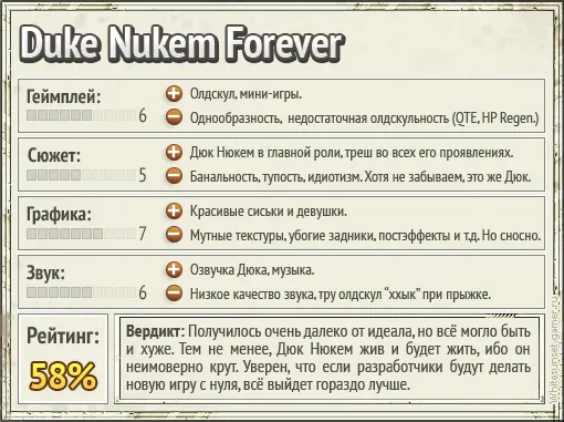 В общем, создается ощущение, что фирме-разработчику нужно было срочно избавиться от этого детища-уродца. И они пошли по офису в поисках сборок частей игры, созданных для презентаций на Е3 и других игровых фестивалей. Прибрали все до кучи, отладили баги, графику подкрутили, чтобы игра хоть как-то смотрелась на современных консолях, и, недолго думая, выпустили. Что же получилось в итоге? Старо-новая игра, вышедшая сегодня, но по своей душе кажется, что ей лет 8 уж точно. Игровой процесс так и остановился далеко в 2000-х годах. За графикой угнаться так и не удалось. Все откровенно завалено нафталином и явно попахивает тухлятиной. В общем, всю игру тащит один только Дюк, ибо он просто неимоверно крут! И только за него игре можно накинуть дополнительный балл.