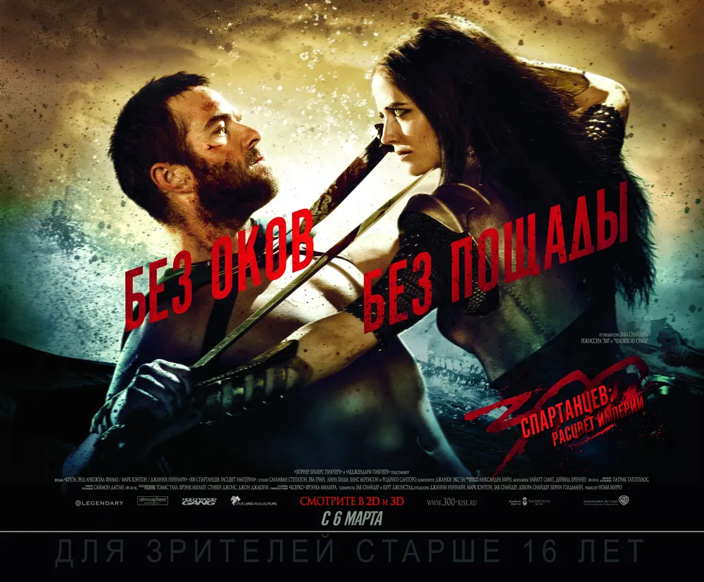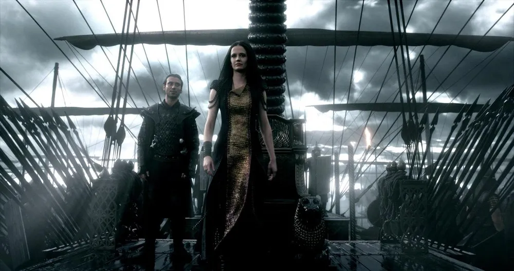 Дать бой захватчикам решаются немногие. Царь Спарты уходит держать проход под Фермопилами на севере, имея всего лишь триста человек, а Фемистокл собирается дать бой персам на волнах Эгейского моря в проливе Эвбея. Этот бой, кстати, назовут «битвой у Артемисия», и автор комикса-первоисточника, Фрэнк Миллер, воспользовался и этим, назвав так главного антагониста фильма. Артемисия (Ева Грин) – воительница, ведущая флот персов в то время, как Ксеркс дает бой спартанцам. Кроме этого факта, и чересчур раздутого масштаба персидской флотилии, этот фильм куда ближе к истории, чем первый.