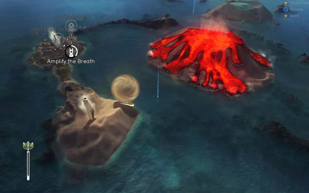 Но главную роль в игровом процессе играет всё же подконтрольное нам Дыхание. С его помощью изначально мы можем лишь поднимать в воздух землю, воду или лаву, набирая их в симпатично выглядящий шарик. И, соответственно, ссыпать/сливать их там, где нам понадобится, вздымая холмы или организуя озерца. Это умение необходимо для того, чтобы, например, создать мостик или дать дикарям пробежать по дну реки, из которой мы в этот момент откачиваем воду. По ходу кампании у нас появятся новые возможности – например, разом погасить весь огонь на всей карте или испарить всю воду, ненадолго превратить Дыхание в чёрную дыру, засасывающую сколько угодно земли/воды/лавы и отправляющую их неизвестно куда, и так далее. Всё это нужно не просто для развлечения, а для решения игровых задачек.