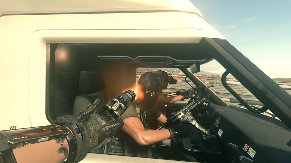 Для начала – «Call of Duty» двумя ногами вступил в будущее. Убогонький «Black Ops 2», конечно, тоже пытался это сделать, но там не позволял сеттинг и традиционно кривые руки инвалидов из Treyarch. Здесь же самое настоящее будущее и совсем другой подход к войне. Теперь у каждого солдата есть свой экзо-костюм, усиливающий физические свойства человека и оборудованный кучей интересных гаджетов. Двойные прыжки? Есть. Сохранение целостности костей при приземлении с большой высоты? Есть. Стимуляторы, что бешено ускоряют солдата, а, следовательно, тормозят все вокруг него? Конечно. Слоу-мо и раньше было в серии, но теперь его хотя бы научно обосновали. А еще сюда встроен портативный раскладывающийся щит и звуковой парализатор, что, подобно медведю для наших поп-исполнителей, лишает всех вокруг слуха и отчаянно насилует мозг потенциальной жертвы.