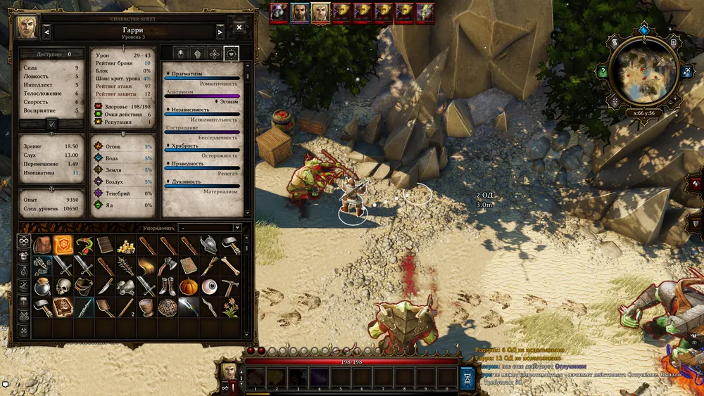 В отличие от кооператива, боевая система здесь лояльна к игрокам, как бы они не играли. Нет, это не значит, что сражаться будет легко, это значит, что каждый игрок может в бою тянуть одеяло на себя, и если у него растут руки из правильного места, а также есть зачатки фантазии, то он вполне может сольно вытянуть раунд. Как я уже говорил, бои тут пошаговые, и чтобы ходить, наносить удары и т.д. необходимы очки действия. Чем прокаченней персонаж и чем быстрей у него скорость, тем меньше очков действия он тратит. Иногда очки действия нужны не только для того, чтобы лупить по врагам. Например, их можно потратить на то, чтобы подобрать выпавший из одного из врагов предмет. А иногда они нужны, чтобы провести махинации в инвентаре, оружие, сломанное там сменить… или достать заранее припасенную бочку с осадным маслом, закинуть ее на поле боя и поджечь. Интерактивность и нелинейность распространяется и на бои. Для победы можно пользоваться не только окружающей местностью, но и различными жидкостями, газами и стихиями, а также сочетанием этого всего вместе. Деремся с огненными гадами посреди лавового поля? Тут срочно нужна бочка с водой, а если есть маг, то и дождик можно пустить. Огненный страхолюд моментально потеряет свой задор, да и спутников будет лупить намного бережнее. Если и не каждый, то, как минимум, один из пяти боев необходимо будет как следует распланировать и подготовиться. Авторы не стали давать персонажам все и сразу, часть способностей можно открыть, не только качая персонажа в определенной боевой ветке, но еще и ища книги, чтобы эту боевую школу заполнить навыками. Без книг, увы, подобная прокачка бесполезна, а без прокачки есть очень большая вероятность, что парочка дрищавых и хлипковатых гоблинов порвут вашу группу из четырех человек в три хода.