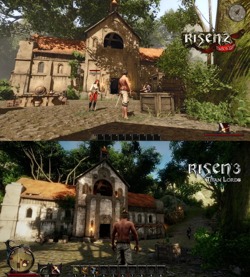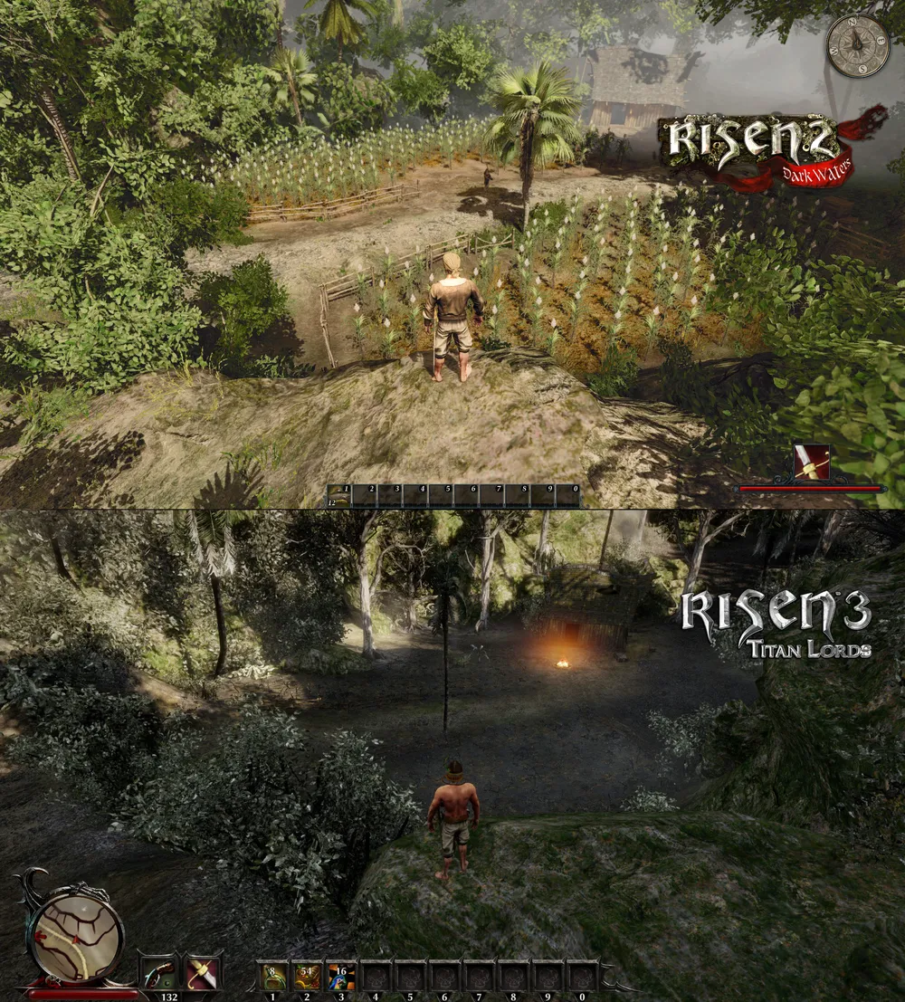 Начинается все, как всегда в серии «Risen» – с корабля. Но в этот раз мы не тонем, не наблюдаем как тонет другой корабль. Мы сражаемся при абордаже судна, и в этот момент «Risen 3» можно даже перепутать с «Assassin’s Creed IV». Игра вообще стала на него очень похожа – больше ярких цветов, прозрачных гладей воды, паркура, «прыжков веры» в воду и торговли бухлом, а также появился некий аналог «орлиного зрения», только с мистическим подтекстом. Но не дайте себя обмануть первым впечатлением, это все-таки «Gothic»… ой, простите, «Risen». Да, теперь эти игры снова можно перепутать – тяжелые мечи, ролевуха, боевая магия. Разработчики смекнули, что новый курс, который они выбрали, конечно, инновационный для серии, но переход на него произошел слишком резко, сразу отпугнув львиную долю игроков. «Risen 3» пытается сгладить углы, она, своего рода, промежуточная стадия между хорошим готическим стилем первого «Risen» и пиратской тематикой «Risen 2». Это пошло игре на пользу, и лично я вздохнул с облечением.