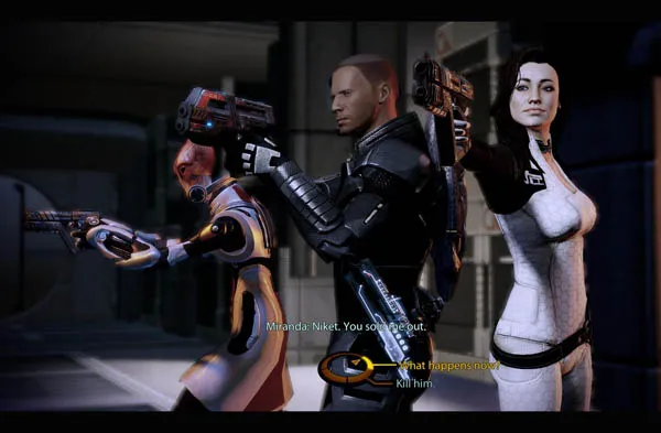 Mass Effect 2, да и первую часть тоже, хорошо характеризует один квест. В нем вам сообщают, что на спутнике-колонии землян группа террористов захватила ракетную базу и готовится выпустить ракеты по колонии. В душе дивясь, зачем на луне, населенной лишь землянами размещать ракеты класса земля-земля, мы высаживаемся на базу и с боем пробиваемся к пульту управления. Никаких переговоров с террористами!(да и с остальными элементами тоже. Зачем выяснять их мотивы?)Однако когда мы добираемся до пульта, естественно оказывается уже поздно(независимо от скорости нашего прибывания. “We were too late! Snap.” Qt the Bishop). Оказывается, что были выпущены две ракеты: одна летит в центр колонии и при попадании вызовет обильные человеческие жертвы, вторая ракета летит в район порта: она вызовет меньше жертв, но сильно навредит боеготовности Альянса и средствам для контроля региона. И вот перед вами очередной глубокий выбор: люди или власть. Вы можете подставить что угодно сюда и получите всю совокупность драмы в Mass Effect. В этой игре никто не подумает о том, чтобы код отмены отменял бы ВСЕ летящие ракеты. В этой игре отменить запуск ракет можно только с пульта, откуда они запущены. В этой игре невозможно говорить с теми, кто хочет запустить ракеты, либо как-то помешать им. В этой игре невозможно думать о чем либо. Нельзя думать – можно только выбирать либо “хорошее или плохое” либо “плохое или чуть более плохое” для разнообразия.