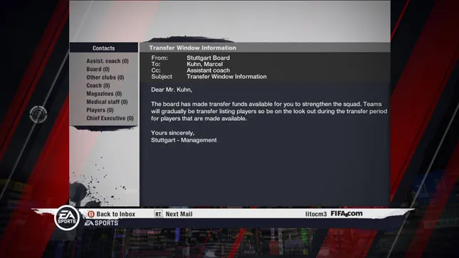 Когда я перехожу к следующему матчу, приходят письма от совета директоров. Он дает мне задание на сезон (закончить сезон на 6-м месте) и информирует меня о ситуации на трансферном рынке.