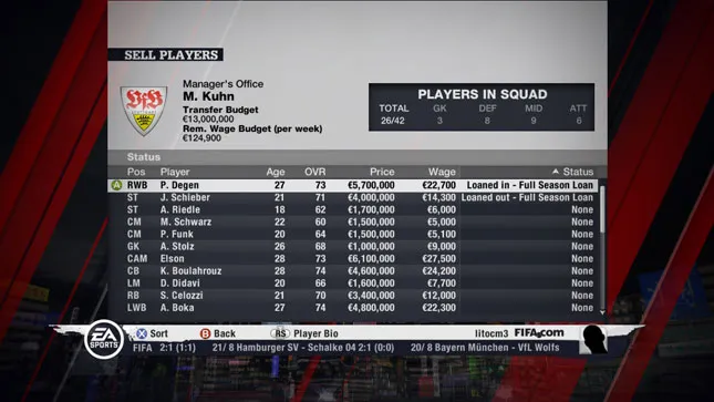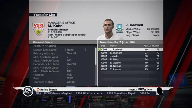 Через пару дней приходят первые предложения касательно игроков моего клуба, и я незамедлительно помогаю ребятам обрести новый дом - я на весь сезон сдаю Riedle в аренду турецкой команде Manisaspor, а Didavi отправляю во Францию, играть в Nice. Мне приходят ответы на другие мои предложения. Udinese и Everton запрашивают за своих игроков больше, чем я предложил. Я сворачиваю переговоры с Udinese, однако повышаю предложенную за Rodwell сумму с 6,4 млн. евро до 6,8 млн. евро (Everton запросил за него 9,4 млн.). Похоже, с французскими клубами мне везет - и Lyon, и Marseille принимают мои предложения. M’Bia - это мой план "Б" на тот случай, если не удастся подписать контракт с Barry, поэтому я делаю ему такое предложение, от которого он точно не сможет отказаться. После этого я прекращаю переговоры с Makoun.