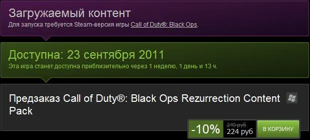 Доброго утра (вечера, дня и ночи) читатели гру. В сервисе цифровой дистрибьюции Steam, стал доступен для предзаказа четвёртый DLC, для Call of Duty: Black Ops, под названием Rezurrection. Как уже все знают, в данном дополнении будут только зомби - карты. DLC станет доступным 23 сентября этого года. О тотальном разрушении, которое можно устроить в этом DLC, а если точнее на карте Moon, можно посмотреть здесь. Новые цены в Steam, очень даже радуют глаз. Have a nice day!