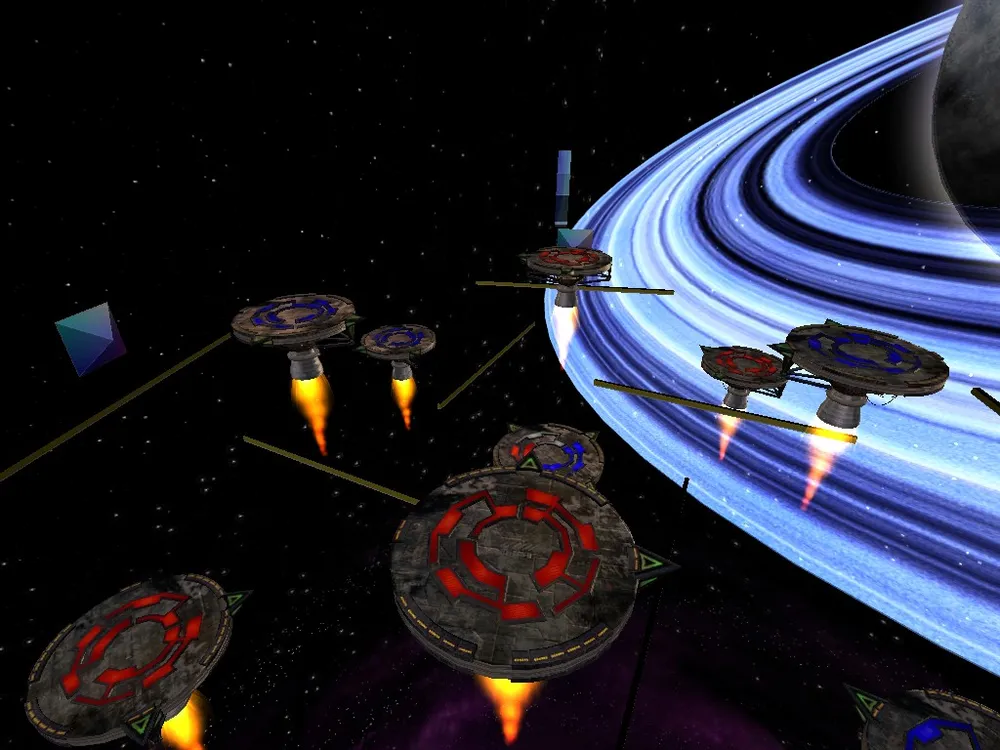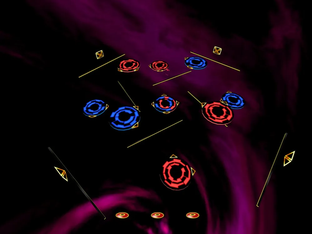 Геймплей в Ricochet очень простой. Как я уже писал, надо столкнуть всех противников с платформ. Сталкиваем мы их используя метательные диски. Дисков у нас всего три, но они постоянно восстанавливаются. Также в игре можно кинуть острый диск, отрубающий противнику голову (по умолчанию правой кнопкой мыши), но на это тратятся все три диска. Метать диск же можно только в двух измерениях - вверх диск запустить нельзя.