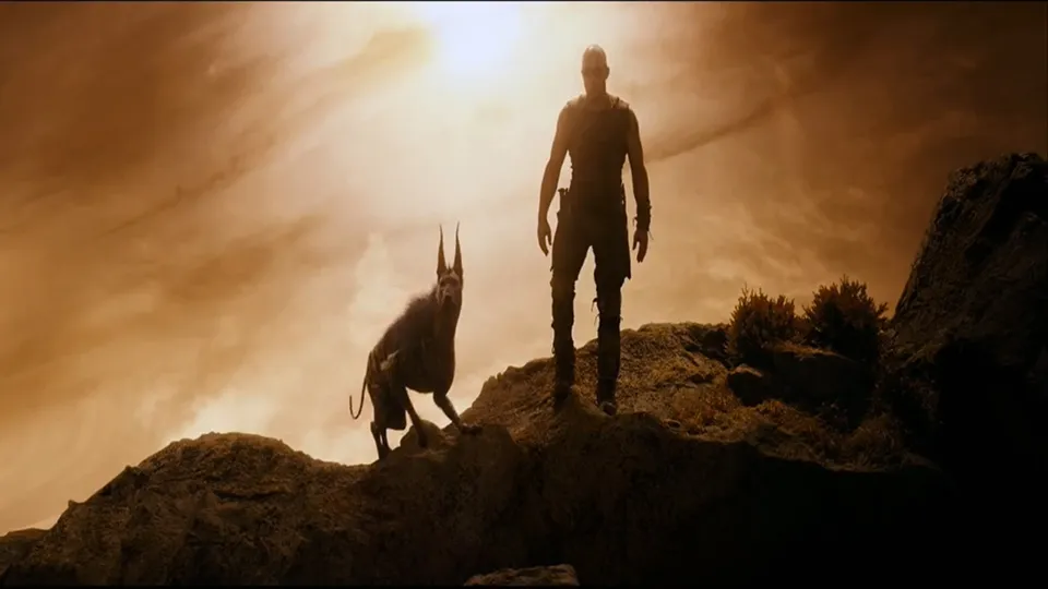 И вот нам сначала нам показывают сцены выживания и поиска убежища Риддиком в знойной каменной вулканической пустыне. Героические сцены охоты и мелодраматичные сцены нахождения умирающих щенков, потом ласки прирученного зверя – гиеноподобного пса на инопланетный лад. Ну, нотка няшности в его лице или морде не помешает блогбастеру. Потом этот питомец поможет, сначала, в испытании яда, потом в обмане наемников. Но все же он погибнет, ну не брать же его с собой, а просто оставлять… не позволяет политкорректность.