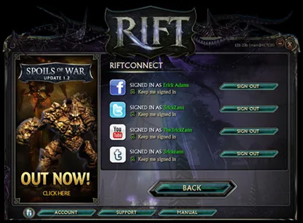 Сотрудники Trion Words сообщили о старте услуги RIFTconnect, позволяющего напрямую загружать текст, изображения и видео изRIFTв социальные сервисы Facebook, Twitter, YouTube и Tumblr. Девелоперы уточнили, что установка RIFTconnect производится непосредственно из "патчера" (RIFT patcher), а для реализации набора его возможностей потребуется предварительно "связать" игровой эккаунт с учетными записями других сервисов.