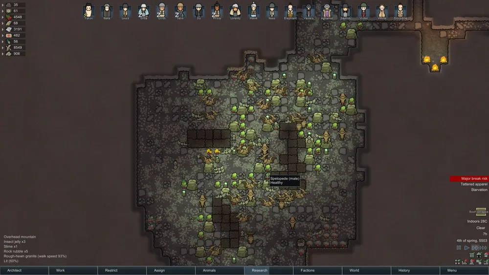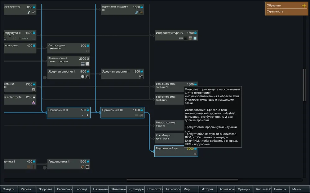 А если говорить о Rimworld, то это классический представитель эволюционировавших симсов. В ваши руки попадает группа выживших после инцидента. Будь то крушение космического корабля, истребление примитивного племени или же заскучавший олигарх, решивший пощекотать нервишки. Хотя лично я предпочитаю пользовательский сценарий, представленный в сборке Rimworld Hardcore SK project. Одинокий путник, стремящийся сбежать с планеты и не имеющий с собой никаких средств к существованию. Мазохизм, да и только. Кстати, постройка космического корабля - это и есть главная задача для наших подопечных, даже если они лишь местные аборигены. Все это благодаря тому, что в игре представлено древо технологий, охватывающее периоды от каменного века, вплоть до Sci Fi будущего.