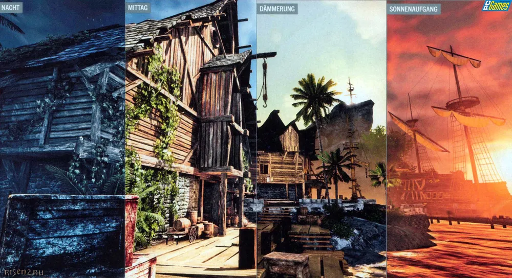 Бьёрн Пакратц:Какие варианты окружающего мира доступны для исследования в Risen 2:Dark Waters? В Risen 2 каждый остров обладает собственной атмосферой и погодными условиями. Будут города, пышные тропические леса, джунгли, идиллические пляжи и, разумеется, будут тёмные пещеры и храмы. Как и в нашем предыдущем продукте, каждый камень будет помещен на своё место вручную, что позволит создать ощущение реального, "живого" мира, чем и славятся наши продукты.