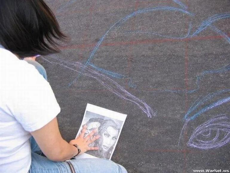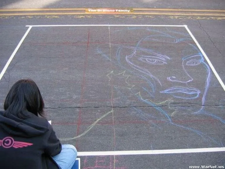 ничего сложного нет, действительно лишь масштабы. Вся суть в том, что рисунок поделен на определенные сектора, те же сектора переносятся на асфальт в большем формате, а там смотрятсяуже на глаз. Назвать рисованием и талантом это сложно, это всего-лишь построения с более-менее набитым глазомером. Разве что хорошая работа цвета.
