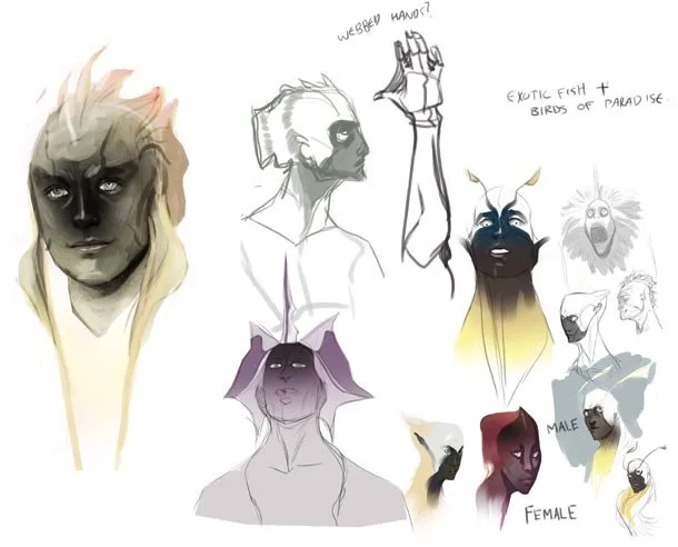 Мы снова начали с зарисовок. Мы пытались перебрать больше от рептилий и морской живности. Но женщины не умолкали: “ Ребята, у вас сексуальные синие инопланетянки, а у нас чувак с рыбьей головой…” Они уже начали расстраивается, по этому мы должны были сделать его привлекательным. У него должен был быть взгляд убийцы, что бы только посмотрев на него можно было это понять. Мы также присматривались к Abe Sapien из Хэллбоя, так как этот персонаж очень интересный и мог бы стать для нас неплохим толчком для дальнейшей работы.