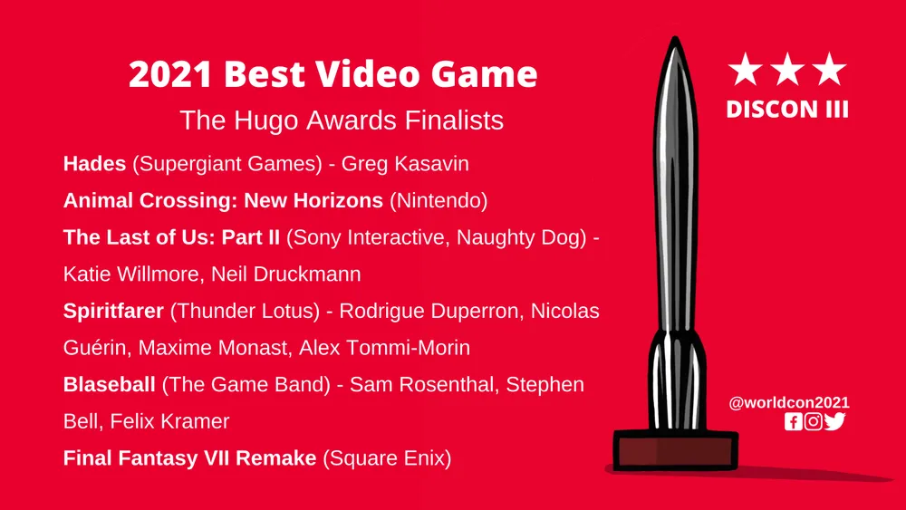 У премии «Хьюго» нет постоянной категории «Лучшая видеоигра». Но временное исключение было сделано. 19 декабря 2021 года игра Hades была объявлена победителем, оставив позади Animal Crossing: New Horizons, Blaseball, Final Fantasy 7 Remake, Spiritfarer и The Last of Us: Part 2.