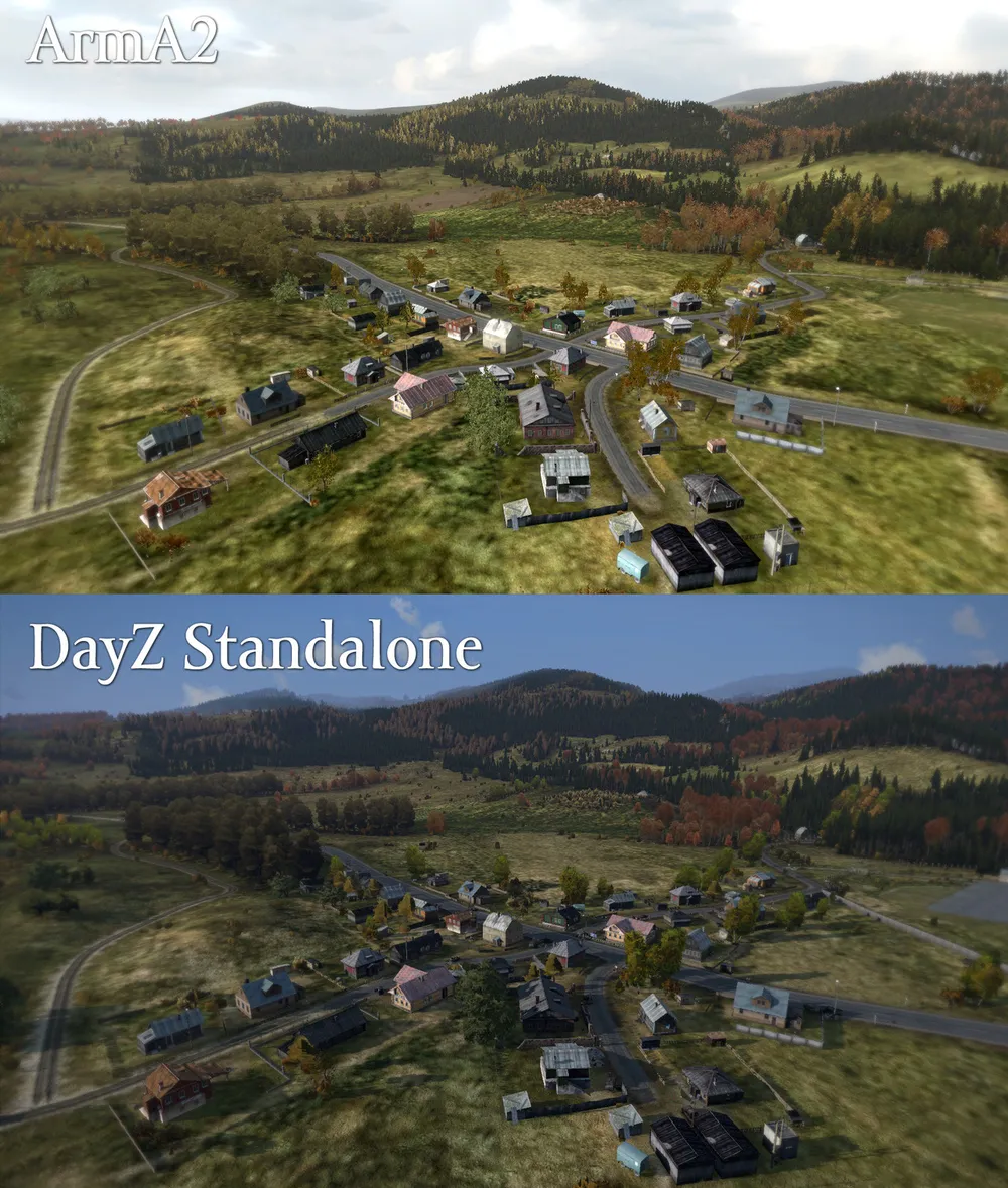 Один из наших ведущих дизайнеров, Mario Kurty, привлек к работе несколько дизайнеров ArmA3, чтобы вместе с ними обеспечить DayZ максимально качественной графикой. В результате это сразу бросается в глаза, особенно с другими улучшениями движка. Эти улучшения действительно делают мир живым и визуально более привлекательным. Выше опубликован сравнительный скриншот, демонстрирующий улучшения.