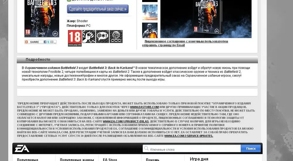 В Ограниченное издание Battlefield 3 входит Battlefield 3: Back to Karkand.* В новое тематическое дополнение войдут и обретут новую жизнь при помощи новой технологии Frostbite 2, четыре полюбившиеся карты из Battlefield 2. Также в дополнение войдет классические оружие и техника из Battlefield 2, уникальные награды, новые достижения/трофеи и многое другое. Не оформившие предварительный заказ на Ограниченное издание игроки, смогут приобрести дополнение Battlefield 3: Back to Karkand спустя примерно месяц после выхода игры.