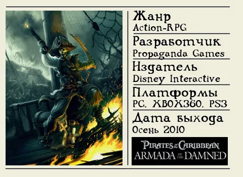 Пока что Propaganda Games трудится, не покладая конечностей, а во время перерыва на кофе хвастается именитыми сотрудниками. Вот вам Дэн Танж – человек, перешедший из Bioware в поисках приключений. Из той же конторы сладкими пряниками переманили Филипа де Росса. А вот и Алекс Питерс, работал с самим Питером Молинье. Последнего в статье придется упоминать неприлично часто, потому что Pirates of the Caribbean: Armada of the Damned – плоть от плоти потомок великолепной (по скромному мнению некоторых геймеров) серии Fable. Кроме того, Разработчик акцентирует наше внимание на одной чрезвычайно важной вещи. Чтобы ловко увернуться от плевков и прочих сопутствующих гнилых помидоров, авторы нежно открестились от ярлыка «игра по фильму». По сути Armada of the Damned – приквел оригинальной трилогии. Действие происходит аж за десять лет до событий кинофильмов. Некоторые знакомые герои так или иначе засветятся на просторах Карибского моря. Например, мы сможем мило побеседовать с Калипсо и спросить у нее прогноз погоды на ближайшие выходные. Известная музыкальная тема за авторством Бадельта («пам парам па-бам – пам-пам-пам-пам») тоже собирается заглянуть на огонек. Но большая часть музыки будет, без сомнения, оригинальной.