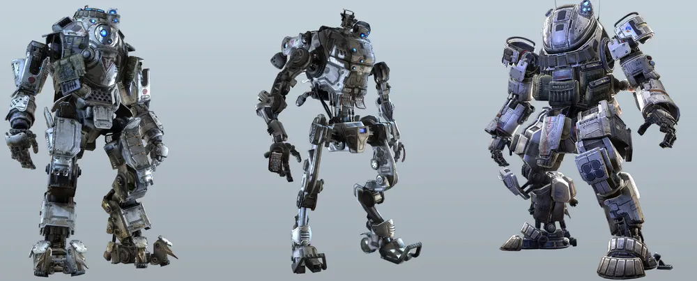 Вот эти красавцы, все три. Слева направо: сбалансированный Атлас, быстрый и дохлый Страйдер и бронированный тормоз Огр. Тип титана определяет устанавливаемое на него ядро, при активации которого Атлас наносит больше урона, Огр включает усиленный щит, а Страйдер еще больше разгоняется. Расширить модельный ряд обещали в дополнениях.