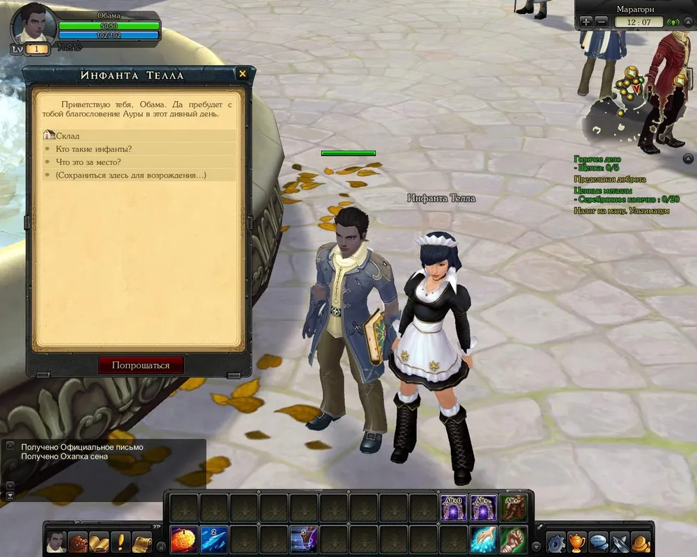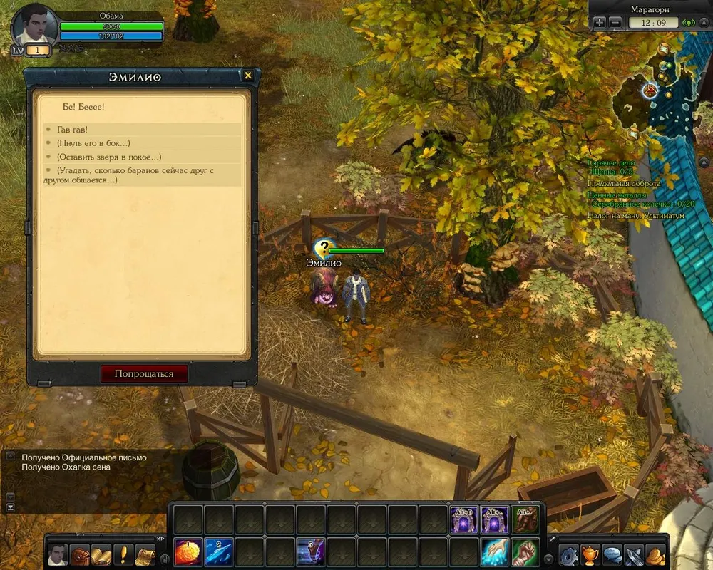 Диалоги в Royal Quest – отдельная тема. Задания, как и прежде, в других MMORPG, столь же нелепы – убей XX монстров, собери YY предметов, бегая по карте, доставь посылку NPC (и не важно, что он стоит в 10 метрах от квестодателя). Однако то количество текста и вышеупомянутый колорит делают свое дело – задания выполнять приятно. Чего только стоит сотрудничество с псевдо-бараном, который просит добыть волчьей шкуры – просто шедевр.