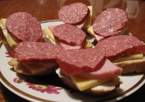 4. Складываем бутерброды горкой на тарелку, несем в комнату и ставим под нос мужчине.