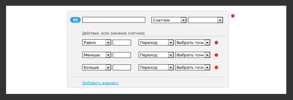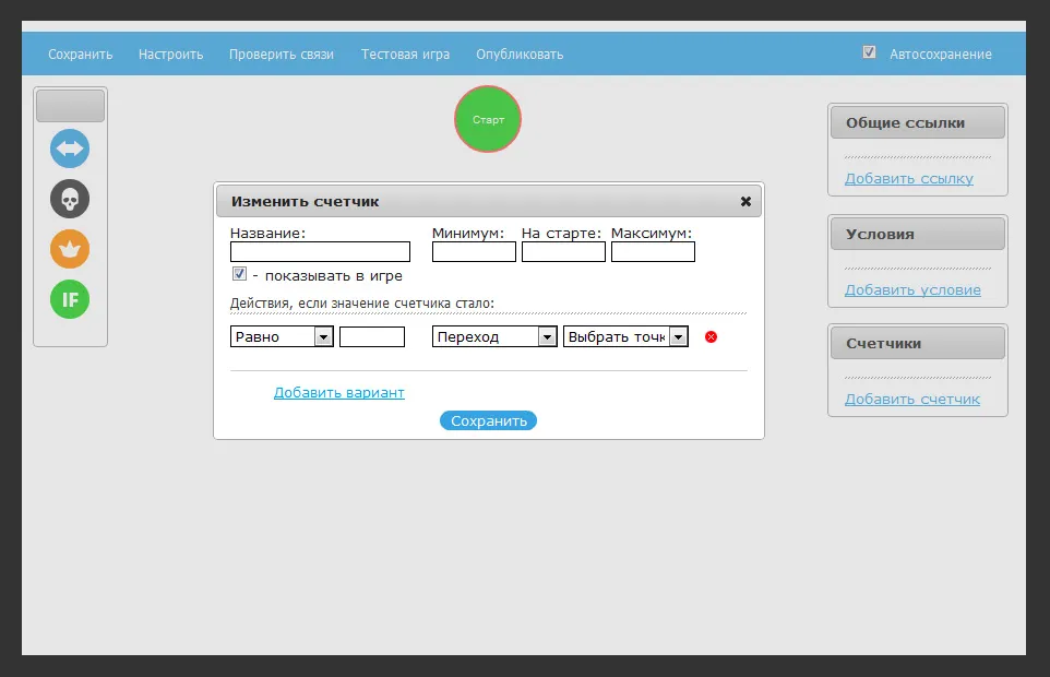 2. Изменение счетчика. Любое действие в игре может вести к изменению исчисляемых параметров. По клику на эту иконку можно задать правила их изменения.