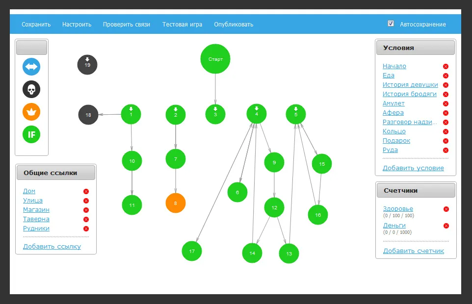 «Операции» (зеленая) - игровая точка, позволяющая управлять различными игровыми параметрами, такими как условия и счетчики.