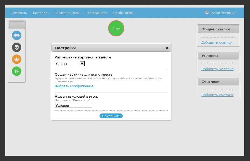 3. Область с игровыми параметрами: «Условия» и «Счетчики»