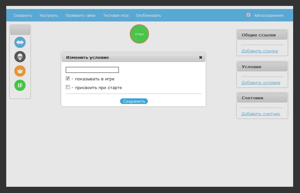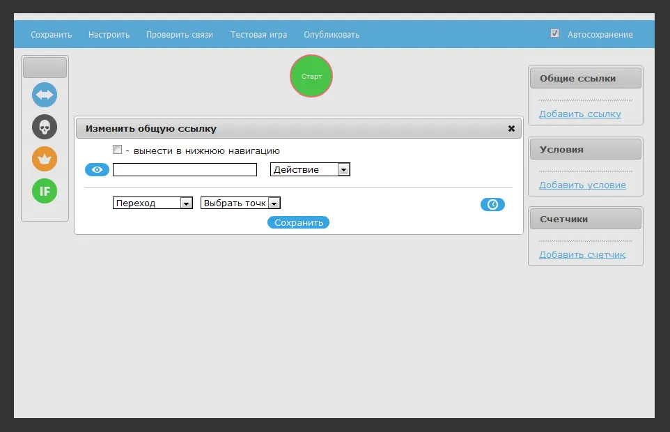 1. Видимость ссылки. По клику на эту иконку можно выбирать те условия, при выполнении которых данная ссылка будет отображаться в игре. Соответственно если условия еще не присвоены, то ссылка в игре отображаться не будет.
