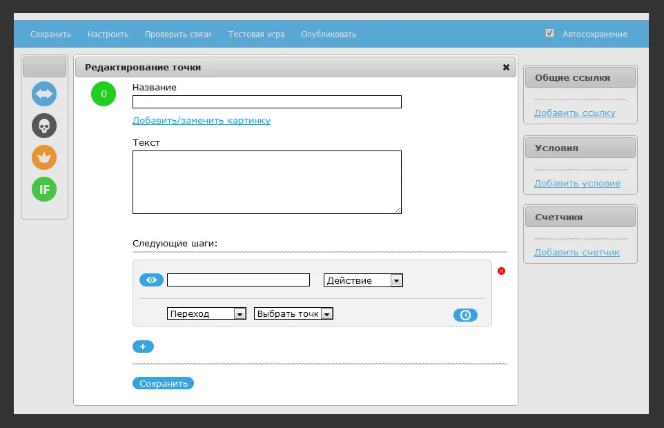 «Развилка» (синяя) - позволяет просто осуществлять переходы между игровыми точками, описывая название ссылки и указывая номер следующей игровой точки.