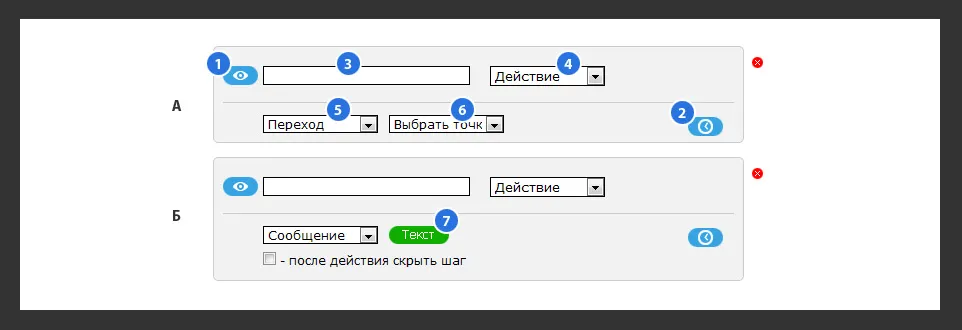 В качестве действия так же может выступать либо «Переход», либо «Сообщение».