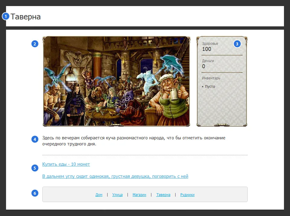 5. Каждое действие по клику на ссылку приводит либо к переходу на другую игровую точку (Вариант «A»), либо к отображению какого-то текста без перехода (Вариант «Б»).