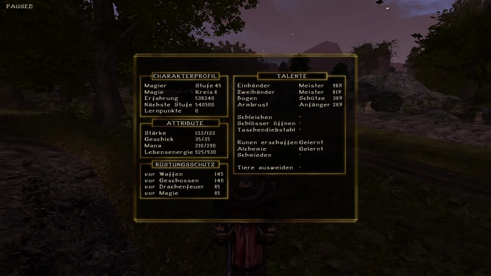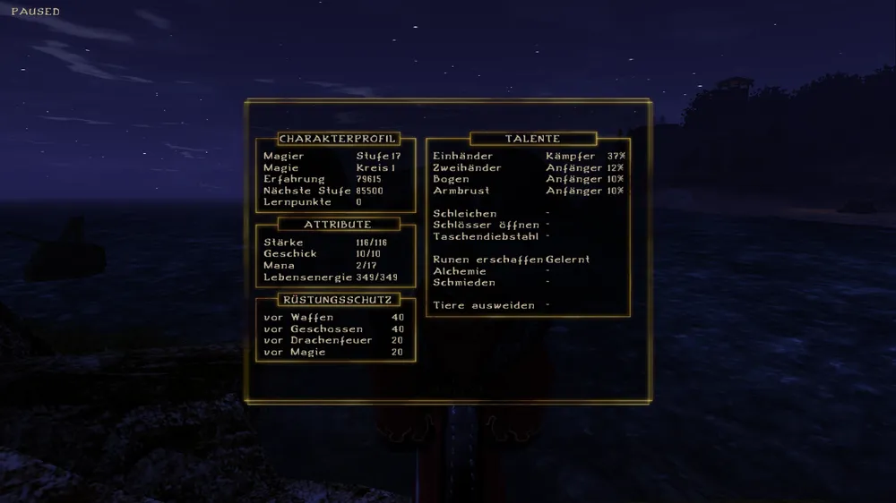 17 уровень, самое начало второй главы, только-только вступил в ряды магов Огня. Из рун лишь Огненная стрела. Съел все предметы и таблички, дающие бонус к силе. Сейчас начнётся охота на варгов в лесах Хориниса, а после этого – в Яркендар, опыта набираться перед походом в Долину рудников.