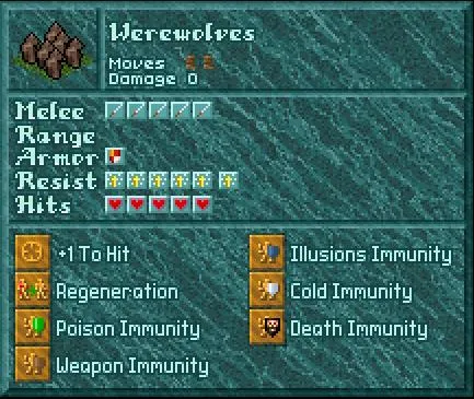 Неплохие бойцы благодаря способности к регенерации и неуязвимости для обычного оружия. Правда, против действительно крутых тварей абсолютно бесполезны, но в остальных случаях стоят потраченной маны. Сила оборотней зависит только от уровня опытности отряда, который в них превращают, и совершенно не зависит от того, кем же этот отряд является. То есть неважно, кого превращать в оборотней - копейщиков или голема, главное, чтобы отряд был достаточно опытный. Логично, что лучше всего в оборотней превращать самые дешёвые войска - копейщиков, предварительно нарастив им пару уровней опыта.