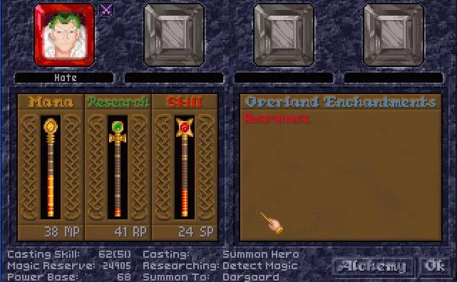 3) Её можно использовать для повышения навыка нашего чародея-властелина - то есть на увеличение количества маны, которую он может потратить на заклинания за ход на глобальной карте или за бой на тактической.