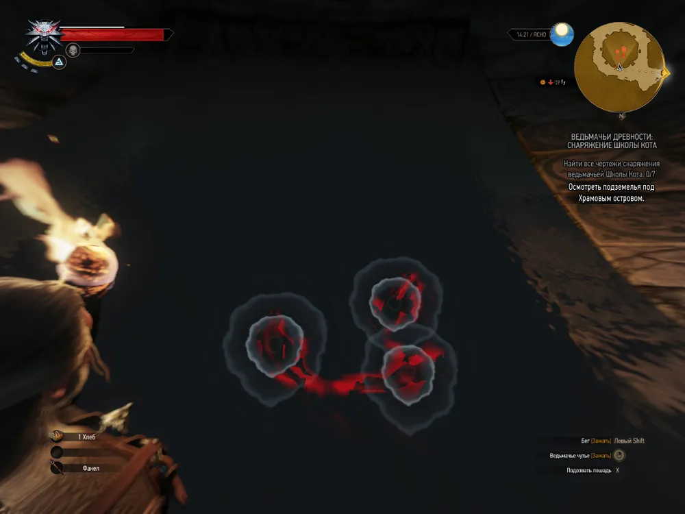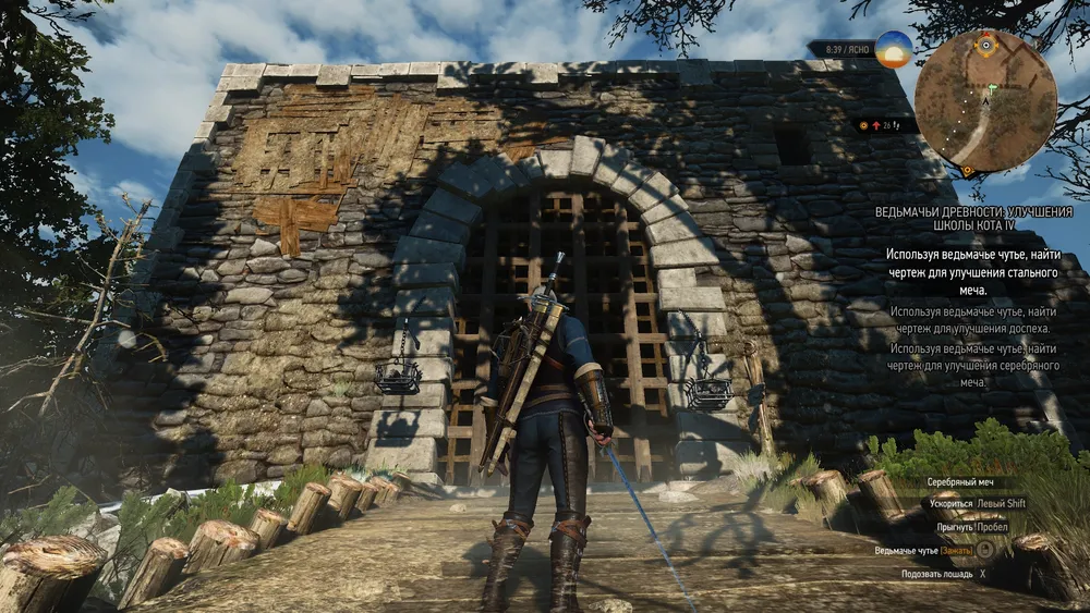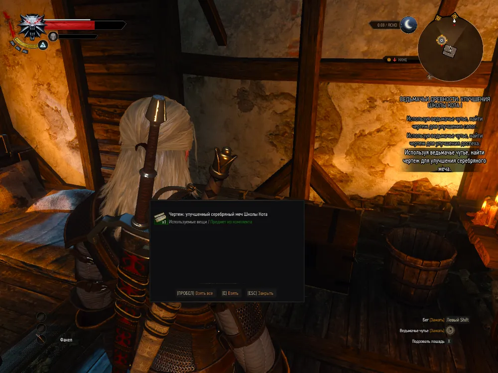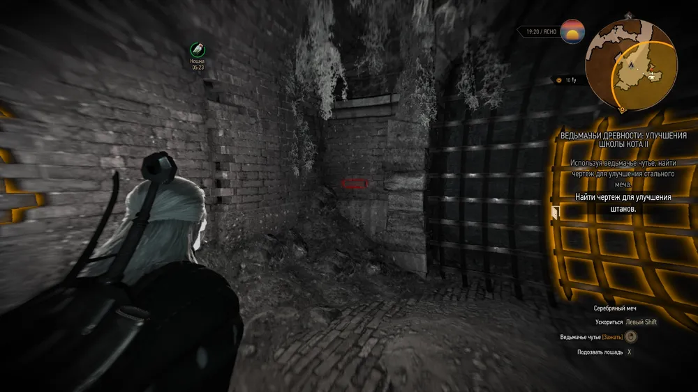 Войти в нужный нам дом можно через дверь со стороны реки. Спускаемся в подвал. Немного пройдя вперед используйте ведьмачье чутье и вы легко заметите подсвеченную стену, открывающуюся с помощью нажатия на кирпич справа. За стеной находится сундук с чертежом.