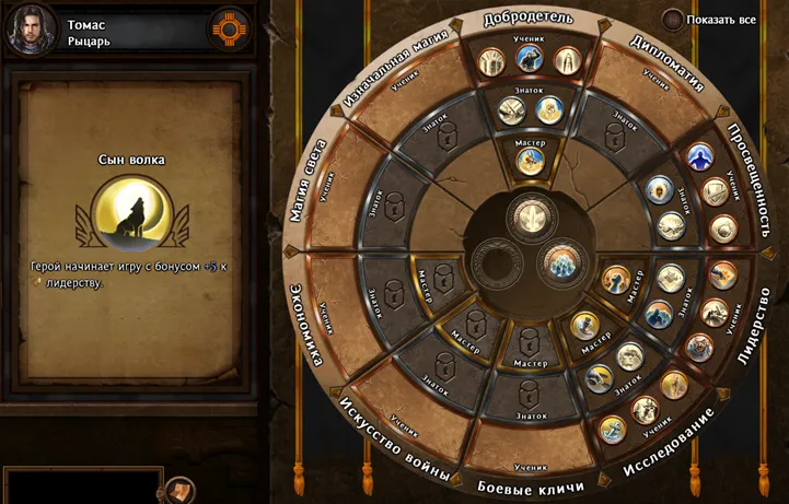 Герой наш, сир Томас Волк, пройдет с нами всю эту кампанию. Наиболее толковой будет прокачка его в лидерство и добродетель. Также есть смысл в развитии скорости передвижения Томаса (на третьей карте придется поторопиться), остальное – по вкусу.