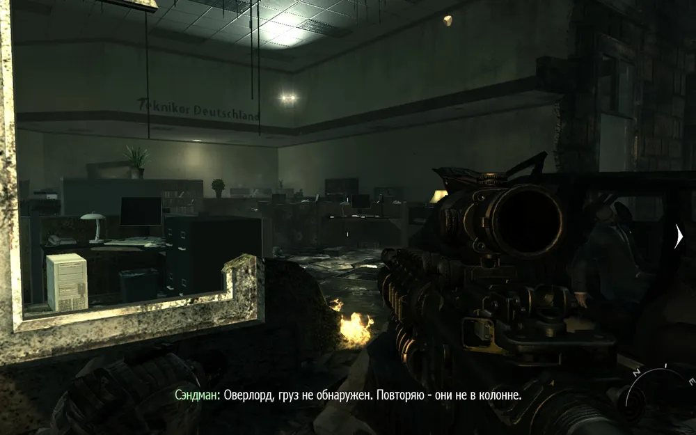- 3. Когда вам скажут заходить в здание (вы заметите внутри надпись Teknikor Deutschland) через дыру в стене, осмотрите рабочие места по правой стороне зала. На одном из столов будет компьютер с разведданными.